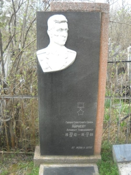Герой Советского Союза.Военный летчик. Капитан.Командир эскадрильи 503-го штурмового авиационного полка 206-й штурмовой авиационной дивизии 7-го штурмового авиационного корпуса 8-й воздушной армии Южного фронта.С 1924 года жил и работал в Ташкенте. По окончании 2-го курса рабфака работал слесарем Самаркандского завода «Дехканин». Окончил школу младших авиационных специалистов, служил механиком, в наземной службе.В 1941 году окончил Энгельсскую военно-авиационное училище пилотов.С июня 1941 года на фронте. В конце октября 1941 года вместе с пятеркой товарищей Армен Айриев штурмовал с воздуха аэродром противника в Полтаве. Двенадцать фашистских бомбардировщиков было уничтожено, что подтвердили и наши разведчики, находившиеся в тылу у врага.В январе 1942 года Армен Айриев уже в качестве командира авиаэскадрильи повел несколько штурмовиков на скопление пехоты и машин врага.Было сожжено двадцать автомашин, несколько сотен фашистских пехотинцев убито и ранено.В июне того же 1942года – еще один дерзкий налет, на этот раз – на Брянский аэродром, где оккупанты базировали свои бомбардировщики. Штурмовики, ведомые капитаном Айриевым, повредили 44 вражеские машины.Особо отличился командир эскадрильи Айриев в период разгрома Таманской группировки противника и освобождения Донбасса.На его боевом счету стало еще 12 вражеских самолетов, 12 танков, 150 автомашин,20 артиллерийских орудий, 10 блиндажей, 3 переправы. Указом Президиума Верховного Совета СССР от 13 апреля 1944 года, за образцовое выполнение боевых заданий командования на фронте борьбы с немецко-фашистским захватчиками и проявленные при этом мужество и героизм капитану Айриеву Армену Тевановичу присвоено звание Героя Советского Союза с вручением ордена Ленина и медали «Золотая Звезда» (№ 1316). После войны А.Т. Айриев продолжал служить в ВВС СССР. В 1947 году он окончил курсы усовершенствования офицерского состава ВВС.С 1951 года майор Айриев А.Т - в запасе. Жил в столице Узбекистана – Ташкенте, работал в Ташкентском горисполкоме. Скончался 13 февраля 1966 года.Одна из улиц Ташкента названа именем Айриева.Награждён орденом “Ленина”, 2-я орденами “Красного Знамени”, орденами “Александра Невского”, “Красной Звезды”, медалью “За оборону Сталинграда “.Место захоронения:Кл№1(Боткинское)Карта№9.