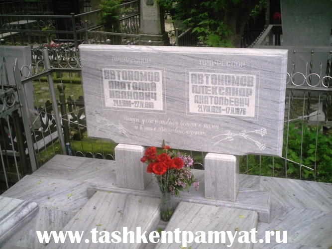 Ученый селекционер.Основатель хлопковедческой науки.Профессор(1955).Член корреспондент АН УзССР(1952).Заслуженный деятель науки УзССР(1944).Лауреат государственной премии(1943) –за выведение высокоурожайных и скороспелых сортов хлопчатника.Окончил сельскохозяйственный факультет Иваново-Вознесенского Политехнического института.С 1924 года работал на Туркестанской селекционной станции (ныне УзНИИ Селекции и семеноводства хлопчатника) в г.Ташкенте. 1926-1933 гг возглавлял селекционную станцию в г. Байрам-Али, Туркменистан.В 1933-55 в НИИ Селекции и семеноводства хлопчатника.Проректор(1951-58), заведующий кафедрой с(1950)г Ташкентского сельскохозяйственного института.Автономов А.И.является основоположником создания, внедрения длинноволокнистых сортов хлопчатника в Средней Азии.Впервые вывел новые оригинальные сорта типа си-айленд с длиной волокна 47-50 мм, скороспелее и урожайнее оригинальных Египетских, впервые вовлекал в гибридизацию перуанский хлопчатник, создал высокоустойчивые к заболеванию фузариозным вилтом новые сорта G . barbadenzy . L . обладающих крупной коробочкой. Создал один из первых крупных научных школ ученых генетиков, селекционеров, семеноводов. Под его руководством успешно завершили свою работу 47 кандидатов и докторов наук.В их числе ученые с мировым именем, как академики С.Х. Юлдашев, С.С.Садыков, Д.А.Мусаев Имел семь авторских свидетельств на выведенные им и внедренные в производство сорта тонковолокнистого хлопчатника №№ 35-1, 35-2, 2836, 2850, 10964, С-6002 и С-6022 созданный совместно с Ю.П. Хуторной.Депутат Верховного Совета УзССР 2-созыва.Награжден 2 орденами “Ленина”(1956-59), 2 орденами “Трудового Красного Знамени”, орденом “Красной Звезды”, медалями.Место захоронения:Кл№1(Боткинское)Коммунистический участок.Карта№2.