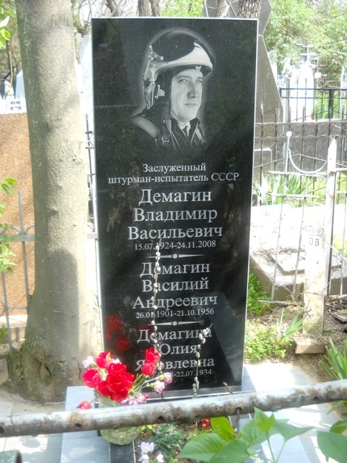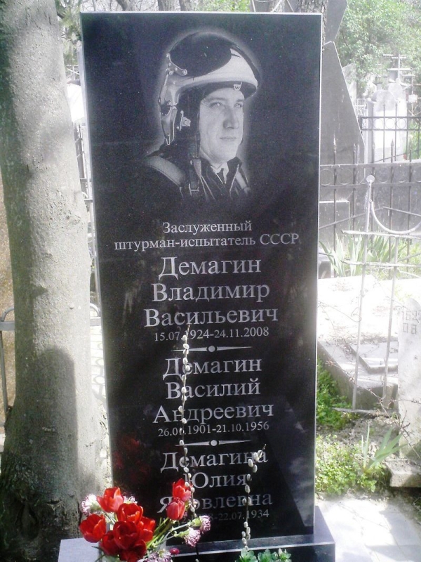 Заслуженный штурман-испытатель СССР.Родился 15 июня 1924г. в г.Ташкенте в семье военнослужащего.Рано лишившись матери, он с детства столкнулся с трудностями жизни.К началу войны он закончил 9 классов средней школы и пошел работать на завод(авиазавод 84), где первый год войны работал сборщиком-клепальщиком, готовя самолеты на фронт. В июне 1942 года Владимир Демагин попросился на фронт и был направлен в Военно-авиационное училище связи в г.Коканд.В училище готовили авиа-связистов разного профиля. Затем он был направлен на фронт под Горловку(Донецкая обл.)в распоряжение штаба 17-ой Воздушной Армии.В.Демагин был определен стрелком-радистом на самолет ПЕ-2 102-го авиационного полка. Возвращаясь с боевого задания его самолет был подбит вражеским "Фоккс-Вульфом". В.Демагин и штурман спаслись на парашютах, а пилот погиб. После госпиталя снова вернулся на фронт и продолжал боевые вылеты, летая в Польшу и в Германию. После войны вернулся работать на авиационный завод им.В.Чкалова, работал контролером сборочного цеха. Желание летать не покидало его и с 1945 по 1949гг. В.Демагин работает бортрадистом на этом заводе, летая на транспортных самолетах. В 1949г. он поступает в Жуковскую школу штурманов-испытателей, которую успешно заканчивает в 1952г.С октября 1952 по октябрь 1980г. Демагин В.В. работал штурманом-испытателем в ЛИСе Авиационного завода им.Чкалова. В 1957г. закончил курсы повышения квалификации штурманов ГВФ. Постоянно работая над повышением уровня своей квалификации, являясь очень мужественным и фанатично влюбленным в свою профессию, Демагин В.В. передавал свой опыт работы молодым летчикам. Вел активную общественную деятельность.Участвовал в первых вылетах серийных транспортных самолетов. Поднимал в воздух первые самолеты вместе с Героем Советского Союза Ю.Курлиным. На его счету АН-22 (7 января 1967г.), ИЛ-76Т (4 ноября 1978г.), построенных на заводе. Принимал участие в испытаниях серийных самолетов ЛИ-2 (1952-1953гг.), ИЛ-14 (1954-1958гг.), АН-8 (1958-1961гг.), АН-12 (1962-1977гг.),АН-22 (1966-1976гг.), ИЛ-76 (1973-1980гг.).и всех их модификаций.Указом Президиума Верховного Совета СССР от 20 сентября 1967г. за многолетнюю и безаварийную работу, за испытания новой авиационной техники В.В.Демагину присвоено звание "Заслуженного штурмана-испытателя СССР".По состоянию здоровья уйдя с летно-испытательной работы в октябре 1980г. В.В.Демагин работал начальником поисково-спасательной службы Ташкентского АПОИЧ (1981-1984гг.), затем дежурным штурманом командно-диспетчерского пункта ТАПОИЧ (1984-1994гг).Общий налет более 13000 часов( более 4 млн.км). Ветеран труда ТАПОИЧ, он постоянно находился на доске почета лучших сотрудников завода.Имя Демагина В.В занесено в энциклопедию Республики Узбекистан(том №3,стр.246-247).Награжден орденами и медалями”За Победу над Германией в ВОВ”, “За Доблестный Труд в ВОВ”, “За трудовую Доблесть”,”50 лет Вооруженных сил СССР”, “Ветеран труда”, “Шухрат”, “Жасорат (Подвиг)”, рядом похвальных грамот.Свою любовь к небу он передал своему единственному внуку Роману Клячко, который, закончив КИИГА и Высшую Летную Кировоградскую Академию работает в настоящее время командиром БОИНГ-747 в транспортной авиации в г.Москва. Он очень гордится своим дедом.Демагин Владимир Васильевич скончался 24 ноября 2008г.Захоронен на Кладбище №1 (Боткинское) Карта 27.