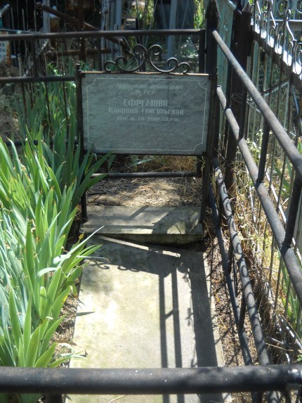Актриса. Народная артистка УзССР (1959). Заслуженная артистка Киргизской ССР.Участвовала в художественной самодеятельности. Профессиональную сценическую деятельность начала в 1936г в городе Пржевальске, а затем в Русском театре в г. Фрунзе. Обладая выразительными сценичными данными, сильным, красивого тембра голосом, Ефремова вскоре заняла ведущее положение в труппе театра. Дарование Ефремовой раскрылось как в драматическом, так и в комедийных ролях - Лиза ("Горе от ума"), Варвара ("Гроза"), Сюзанна ("Женитьба Фигаро"), Тоня ("Как закалялась сталь"). Нора. С 1952 работает в Русском театре в Ташкенте. В этот период определяются основные особенности творчества актрисы - взволнованность, искренность, простота и задушевность исполнения. Особенно удаются Ефремовой образы современных советских женщин. Среди ее лучших ролей: Таня (о. п. Арбузова), Галина Демидова ("Живет на свете женщина" Аграненко), Люся ("Годы странствий" Арбузова). Играла также Поэму ("Не называя фамилий" Минко), Холисхон ("Тайны паранджи" Хамзы), Фань И ("Тайфун" Цао Юя). В. Д.Место захоронения:Кл№1(Боткинское).Карта №14.