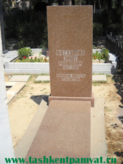 Писатель, драматург. Заслуженный деятель искусств Уз ССР (1963).Народный писатель Уз ССР (1983).Родился в деревне Митраулы, Васильсурского р-на, Нижегородской области, в крестьянской семье. Учился на Высших педагогических курсах (1922) и в вечернем педагогическом институте в Ташкенте. В 1925-27г служил в Красной армии. Долгие годы работал педагогом, был на партийной работе в Самарканде (1927 – 31), в Управлении по делам искусств, на киностудии, ответственным секретарем в аппарате Союза писателей Узбекистана (1951 – 54), возглавлял Узбекское управление по охране авторских прав(1931 -51). В годы Великой Отечественной войны Зиннат Фатхуллин находился на фронте, был корреспондентом армейской газеты «За честь «Родины». Драматургическую деятельность начал пьесой "Бутоны" (1928) о борьбе народа за новую, счастливую жизнь. Пьеса "Маска сорвана" (1932) показывает борьбу узбекского народа против буржуазно- националистической идеологии, пьеса "Орел раздавлен" (1931) - борьбу с внутренними и внешними врагами советской власти. Пьесы "Независимость" (1933) и "Золотая осень" (1937) посвящено хлопководам Узбекистана, "В дни испытаний" (1946) - героям Отечественной войны. Вопросы ирригации ставит пьеса "Кровь земли" (1963), комедия "Ласточка моей весны" (1964) показывает жизнь колхозников республики. Пьесы Фатхуллина с успехом шли на сценах театров республики и за ее пределами. В послевоенные годы 3.Фатхуллин наряду с драматическими пишет и прозаические произведения. Его повесть о Герое Советского Союза Кудрате Суюнове «Немеркнущая звезда» выдержала несколько изданий в Ташкенте и в Москве. В Москве вышел также сборник пьес 3.Фатхуллина. Он является автором повести «Я говорю тебе - живи!», музыкальной драмы «Ценою жизни» (совместно с Ш. Сагдуллой - 1957).Изданы сборники пьес и избранные произведения 3.Фатхуллина в трех томах.3.Фатхуллин является автором сценария художественного фильма «Возвращайся с солнцем». За заслуги в области литературы 3. Фатхуллин награжден орденами «Красной Звезды», «Знак Почета», медалями. Место захоронения: Мемориальное кладбище «Чигатай».