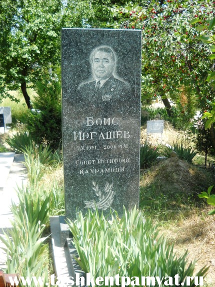 Герой Советского Союза.Заслуженный юрист УзССР.Родился в 1921 году в Самарканде.Окончил н/среднюю школу.После окончания школы работал в Самаркандском драматическом театре.В Советскую Армию призван Самаркандским горвоенкоматом в 1941 году.Гвардии старшина, разведчик 8-й батареи 132-го гвардейского артиллерийского полка 60-й гвардейской стрелковой дивизии.Гвардии старшина Иргашев в ночь на 26.10.1943 несколько раз переправлялся через Днепр, вместе со связистами прокладывая телефонную линию от огневых позиций на НП полка в районе о.Хортица (на Днепре, у Запорожья). В течение дня с пехотинцами отражал многочисленные контратаки врага. Оказавшись в окружении, в рукопашной схватке уничтожил несколько гитлеровцев, захватил вражеский пулемет.Нитка связи была протянута под ожесточенным вражеским огнем, но днепровские волны то и дело рвали кабель. Несколько раз возвращался гвардии старшина Иргашев под обстрелом с правого берега на левый и обратно, восстанавливая связь.С первым десантом он закрепился на острове Хортица, вместе с пехотой отражал яростные контратаки гитлеровцев, а в короткие минуты затишья проверял и восстанавливал связь с батареей.Когда врагам удалось достигнуть наших окопов, гвардии старшина Иргашев в рукопашной схватке убил троих, а из автомата скосил еще полтора десятка фашистских солдат. Оказавшись во вражеском окружении, гвардии старшина Иргашев упал и притворился мертвым. В то же время он не переставал следить за происходящим вокруг. И он увидел, что пулемет, установленный немцами неподалеку от него, не дает возможности нашим подразделениям высаживаться на берегу. Поэтому он незаметно выбрался из окопа, подкрался к пулеметчикам, уничтожил их, а пулемет развернул в обратную сторону, уничтожая огнем врагов. Своим смелым поступком он во многом содействовал успешной высадке нашей пехоты и захвату важного плацдарма.Указом Президиума Верховного Совета СССР от 22 февраля 1944 года гвардии старшине Иргашеву Боису Хамидовичу присвоено звание Героя Советского Союза.В 1944 демобилизован из армии.В 1947 окончил Высшую партшколу при ЦК КП Узбекистана, в 1952 - Ташкентский юридический институт.В 1946-48 годах секретарь Самаркандского областного комитетета ВЛКСМ.Заведующий отделом газеты « Узбекистан сурх», инструктор ЦК КП УзССР (1952 -56).Начальник отдела кадров Министерства социального обеспечения УзССР(1956 -68).Старший офицер комитета Госбезопасности УзССР.Председатель Ташкентской секции Советского комитета ветеранов войны. Награжден орденом «Ленин», «Красной Звезды», «Отечественной войны 1 ст», «Славы 3 ст», медалями.Место захоронения:Кладбище Ялангач -2.