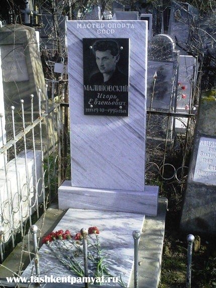Футболист. Нападающий. Мастер спорта СССР. Футболист футбольных команд Пахтакор» Ташкент, «Политотдел» Ташкентская область.У каждого спортсмена случается звездный час. Эмоциональный подъем приводит к высоким результатам. Это имеет отношение и к Игорю Малиновскому. Когда в разгар лета 1962 года за различные прегрешения дисквалифицировали лидера атак «Пахтакора» Геннадия Красницкого, команда была на подъеме. «Пахтакор» реально претендовал на выход в финальную пульку. Место Красницкого в атаке занял Игорь Малиновский. Он был ровесником Геннадия и, хотя уступал ему в напористости и целеустремленности, багаж его футбольного умения был на достаточно высоком уровне.Дебютировал Игорь в матче с «Крыльями Советов» в Ташкенте, «Пахтакор» выиграл – 2:1, оба гола забил Малиновский. Очередная игра с ленинградским «Динамо», 1:0 победили ташкентцы, гол – Малиновский. В Кутаиси пахтакоровцы проиграли со счетом 1:2 (Малиновский не забивал), а потом опять два матча в Ташкенте. С минской «Беларусью» - 3:1 (один из голов – Малиновский) и «Зенитом» - 2:1 (второй гол - Малиновский).Таким образом, в пяти подряд матчах Игорь Малиновский забил пять голов. Ни один из дебютантов высшей лиги не смог добиться подобного. Во многом благодаря этому «Пахтакор» вошел в финальную пульку с неплохим запасом очков и по завершении чемпионата занял шестое место.Но в очередном сезоне у Малиновского прицел сбился, правда, в 1964 году он сыграл прилично, а весь 1965 год оставался в запасе.Чемпионат-1966 Игорь Малиновский провел в ферганском «Нефтянике», а в 1967 году – в «Политотделе». Но наиболее успешно Малиновский играл в Навоинском «Зарафшане», где его любили, и где завершил свою игровую карьеру.Любители футбола нашей республики помнят интересного форварда, который несколько лет радовал нас, выступая в командах Узбекистана. Игорь Малиновский из плеяды пахтакоровцев, которые зажгли на футбольной арене славное имя «Пахтакор».Футбольние болельщики этого не забудут. Место захоронения:Кл№1(Боткинское)Карта№24.