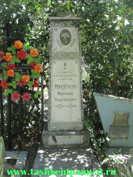 Герой Советского Союза.Родился в 1923 году в селе Романовна Саратовской области. Русский. Член КПСС. Призван в Советскую Армию Фрунзенским райвоенкоматом города Ташкента. Старший сержант, разведчик 3-го стрелкового батальона 935-го стрелкового полка 306-й стрелковой дивизии. Награжден орденом Красной Звезды и орденом Славы III степени.В сентябре 1944 года 3-й стрелковый батальон оборонял шоссе, ведущее к столице Советской Латвии — Риге. Всеми силами стремились фашисты отнять у наших войск эту важную стратегическую дорогу. Шесть раз поднимались гитлеровцы в атаку на позиции батальона, используя танки «пантера» и мотопехоту.Батальон героически сдерживал яростный натиск врага, однако двум танкам удалось прорваться к нашим траншеям, и они начали утюжить их, заваливая бойцов землею. В то же время две другие «пантеры» зашли с тыла.Фашистская пехота уже готова была соскочить с бронетранспортеров и, прячась за броней, начать расстреливать наших солдат, и вот в эту критическую минуту боя старший сержант Михуткин, захватив противотанковые гранаты, пополз навстречу бронированным чудовищам.Одну за другой бросал он гранаты под гусеницы. Два танка развернулись и застыли.Ободренные примером бесстрашного воина, другие бойцы также подхватили гранаты, прилегли к противотанковым ружьям. Подбитые танки и бронетранспортеры останавливались у самых траншей. А там пришла очередь вражеской пехоты: гитлеровский батальон полег под огнем, открытым нашими стрелками. Шоссе осталось в наших руках.Осколками гранат сам Михуткин был тяжело ранен.Указом Президиума Верховного Совета СССР от 24 марта 1945 года старшему сержанту Михуткину Михаилу Андреевичу присвоено звание Героя Советского Союза. Был демобилизован по инвалидности. Жил в столице Узбекистана – городе Ташкенте. Скончался 20 декабря 1968 года.Награждён орденом Ленина, орденами Красной Звезды, Славы 3-й степени, медалями.Место захоронения:Кл№1 (Боткинское).Карта №4.