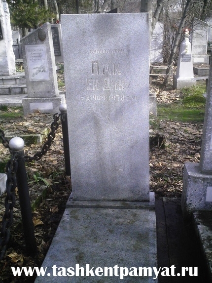 Композитор.Первый корейский композитор Узбекистана.Окончил рабфак Дальневосточного педагогического института(1930), Ташкентскую государственную консерваторию по классу композиции Б.Б.Надеждина(1945).В 1945-53г работал музыкальном руководителем кружка худ.самодеятельности в средней школе.С 1953 по 1959гг занимался композицией.С 1959-1969гг старший преподаватель Ташкентской консерватории на факультете теории музыки.В 1969 ему была поручена организация нового корейского ансамбля песни и танца при Узбекскской государственной филармонии.С 1972 г занимался творческим трудом.Член Союза композиторов Узбекистана с 1945г.Основное место в его творчестве занимало сценическая музыка.Сотрудничая с корейским музыкально-драматическим театром, он написал музыку к ряду спектаклей.Среди них «Хон Гиртон» драматурга Ким Гичера, «Тори и Сунтхан» Цай Ена, музыкальная драма «Хон Бемдо» Тхай Дян Чуна, пьеса «Актриса» Ен Сен Ена, «Суир Сунай» Ли Ден Нима.Музыка этих спектаклей основана на сочетании корейского музыкального фольклора и оригинальной музыки Пак Ен Дина.В 1950годах с успехом шла в театре им.Мукими музыкальная драма Пак Ен Дина «Южнее 38-ой параллели.Композитор создал большое количество сольних и хоровых песен на различные теми, в которых воспевается труд, молодость, образ Родины, дружба и любовь.Среди них песни: «Колхозная девушка», «Ожидание», «Девичий секрет», «О реке Думанган», «Первая любовь», «Качели», «Возмездие старика», «Рисосборщица», «Сырдарья», «Девушка и парен», «Песня о Чирчике», «Вальс о хлопке», и др.Из сочинений, написанных композитором выделяются его песни: «Дорога в Пхеньян», «Молотьба», «Крестьянское гулянье», из корейских народных песен: «Хван Чори», «Ме Хян-сан», «Катури», «Песня рыбаков», «Гунбан».Пак Ен Дин – автор двух больших концертных программ для корейского ансамбля песни и танца.Композитор много сил и энергии отдавал развитию художественных самодеятельных коллективов в корейских колхозах Ташкентской области.Активно участвовал в общественной жизни Союза композиторов Узбекистана.Награжден медалями “За доблестный труд”(1959), “За трудовое отличие”(1969).Место захоронения :Кл№1 (Боткинское) Коммунистический участок.Карта№3.