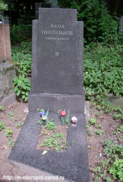 Один из ведущих режиссёров немого кино, сценарист, актёр. Заслуженный деятель искусств РСФСР (1935).Заслуженный деятель искусств Узбекской ССР (1944)(за фильм "Насреддин в Бухаре", 1943).Яков Протазанов родился 23 января 1881 в Москве в купеческой семье. В 1900 году окончил коммерческое училище и работал продавцом в московском АО «Шрадер и К». В 1904—1906 годах занимался самообразованием во Франции и Италии. С 1906 года, сменив ряд профессий (был конторщиком, бухгалтером, переводчиком), стал помощником режиссёра московской кинофирмы «Глория».С 1910 года на фирме «Глория», купленной кинопредприятием П. Тимана и Ф. Рейнгардта, снял ряд фильмов в соавторстве с В. Р. Гардиным. В 1912 году ставит «скандальный» фильм о Льве Толстом «Уход великого старца», который был запрещён к показу в России по просьбе семьи писателя, но имел значительный успех за рубежом. В 1914 году, завоевав репутацию наиболее культурного режиссёра-профессионала, перешёл в кинофирму И. Ермольева.Шедевры дореволюционного Протазанова — фильмы «Пиковая дама» и «Отец Сергий». В 1918 году, вместе с группой актёров и режиссёров кинофирмы И. Ермольева эмигрировал и работал во Франции, Германии, в кинофирмах Пате, Гомон, УФА, где в период с 1920 по 1923 год снял ряд фильмов — «За ночь любви», «Правосудие прежде всего», «Тень греха», «Паломничество любви», «Страшное приключение».В 1923 году вернулся в СССР и на фабрике «Межрабпом-Русь» снял ряд известных авантюрных и комедийных фильмов: «Аэлита», «Процесс о трёх миллионах», «Белый орёл», «Закройщик из Торжка», «Праздник святого Йоргена».Протазанов открыл талант многих киноактёров: Ивана Мозжухина, Игоря Ильинского, Михаила Жарова.Международная выставка декоративных искусств в Париже (1937) (Золотая медаль, фильм «Бесприданница»).Во время войны Протазанов оказался среди тех кинематографистов, которые были эвакуированы в Ташкент. Кинокомедия "Насреддин в Бухаре" (1943, Насреддин - Л. Свердлин) – была последняя работа режиссёра. Умер 8 августа 1945 г. в Москве.Похоронен на Новодевичьем кладбище (2 участок.25 ряд).P.S. Фамилия режиссёра на памятнике написана неправильно.Фотографии Двамала .www.m-necropol.narod.ru
