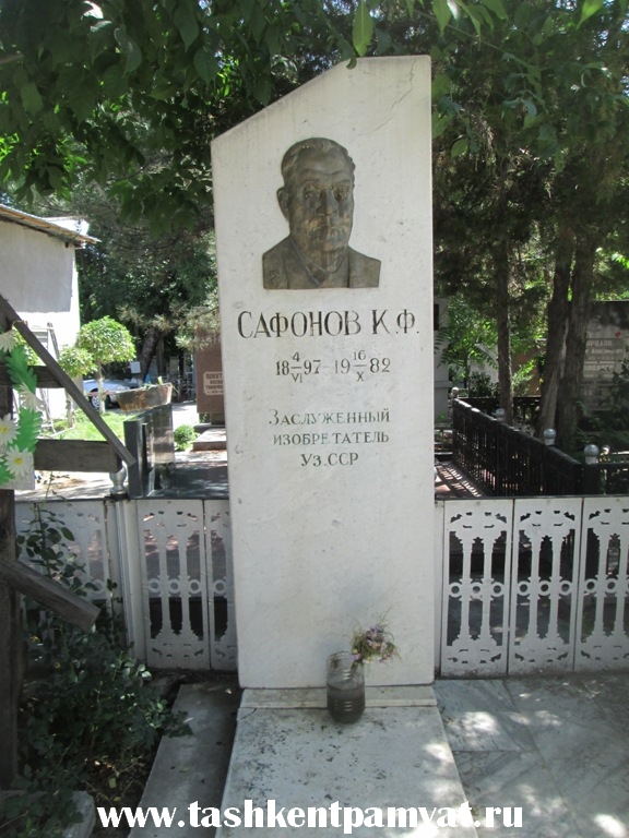 22 ноября на 37 день пути первый эшелон прибыл в столицу Узбекистана – Ташкент. Здесь началась новая жизнь завода, точнее жизнь нового завода, новая история трудового коллектива. Тихая размеренная жизнь на железнодорожной станции Чирчик – Горный за один день изменилась…Личное дело Сафонова К.Ф. закончено в 1969 году последним документом-приказом министра электротехнической промышленности А. Антонова за № 15-к от 16.01.1969 г. следующего содержания: «Освободить т. Сафонова Константина Федоровича от должности директора Ташкентского кабельного завода «Ташкенткабель» Главного управления кабельной промышленности Министерства в связи с переходом на пенсию».После ухода с должности директор К. Ф. Сафонов перешел работать консультантом в ТашНИКИ. В семидесятые годы он много внимания уделял становлению молодых специалистов, опекал Совет молодых специалистов завода «Ташкенткабель».16 октября 1982 года на 88-м году жизни К. Ф. Сафонов скончался. В Ташкенте, в жилгородке кабельщиков (микрорайон Ташкент, примыкающий к территории завода), в названии одной из улиц увековечена память о первом директоре. «Сафонова кучаси» - такое название на узбекском языке носит улица Сафонова.Место захоронения:Кл №1 (Боткинское).Карта №1.