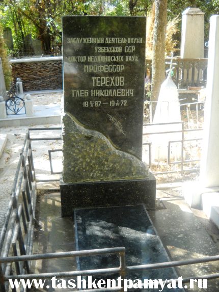 Патологоанатом.Доктор медицинских наук (1936).Профессор. Заслуженный деятель науки УзССР(1944).Профессор Г. Н. Терехов родился 27 ноября 1887 г. в Москве. В 1906 г. он окончил гимназию и поступил на естественное отделение физико-математического факультета Московского университета. В 1914 г. он был призван в действующую армию и направлен лекарем без чина (младшим врачом) на службу в Крондштадтскую крепость.В 1916 г., получив диплом врача в Петербургском медицинском институте, Глеб Николаевич продолжил военную службу. После революции 1917г. Г. Н. Терехов вступил в Красную Армию и был направлен врачом в стрелковый полк. В 1921 г. он демобилизовался из рядов Красной Армии и стал работать преподавателем фельдшерско-акушерской школы по нормальной и патологической анатомии в Рязани. С 1926 г.ассистент кафедры патологической анатомии САГУ.В 1935 г. присвоена ученая степень кандидата медицинских наук по совокупности научных работ. Докторскую диссертацию защитил в 1936 г. («Патологическая анатомия висцерального лейшманиоза в Средней Азии»). Автор 125 научных работ, посвященных изучению краевой патологии, спру, детского висцерального лейшманиоза, бруцеллеза, токсического гетита с асцитом. С 1930 пo 1966 гг. зав. кафедрой патологической анатомии, с 1938 по 1941 гг. по совместительству зав. кафедрой патологической физиологии, с 1966 по 1972 гг. профессор- консультант кафедры Ташкентского медицинского института. Подготовил 5 докторов и 15 кандидатов мед. наук. Был членом правления Всесоюзного общества патологоанатомов, членом Президиума ученого медицинского совета Наркомздрава УзССР, членом редколлегии «Медицинского журнала Узбекистана». Награжден орденом «Трудового Красного Знамени», значком «Отличнику здравоохранения» и 4 медалями.Место захоронения: Кл№1(Боткинское).Коммунистический участок.Карта №2.